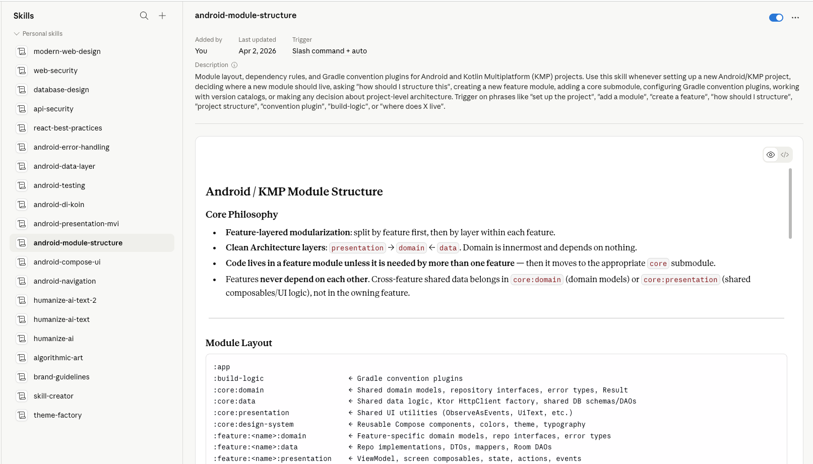 The skill-creator skill can help — it has notes on how to write descriptions that trigger correctly and how to structure the body for fast scanning. But the real work is knowing your own preferences well enough to write them down clearly. That part nobody else can do for you.