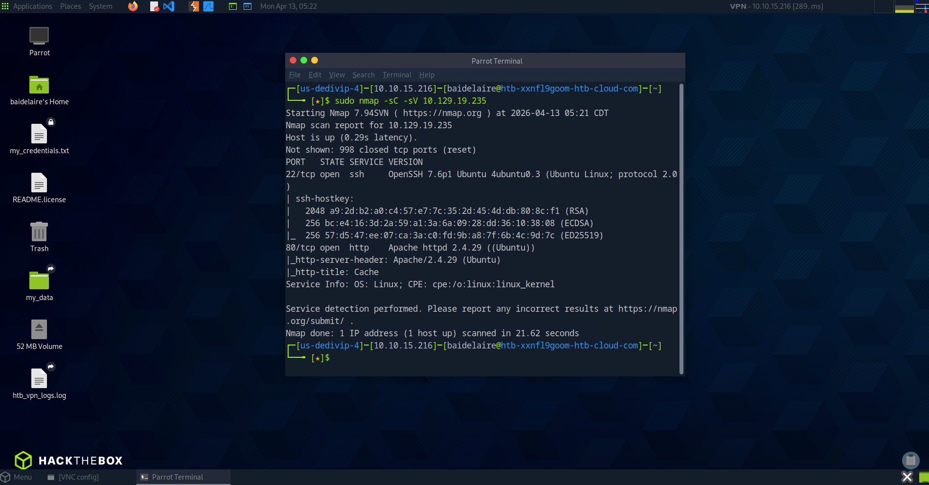 sudo nmap -sC -sV 10.129.19.235The scan showed only two exposed services: