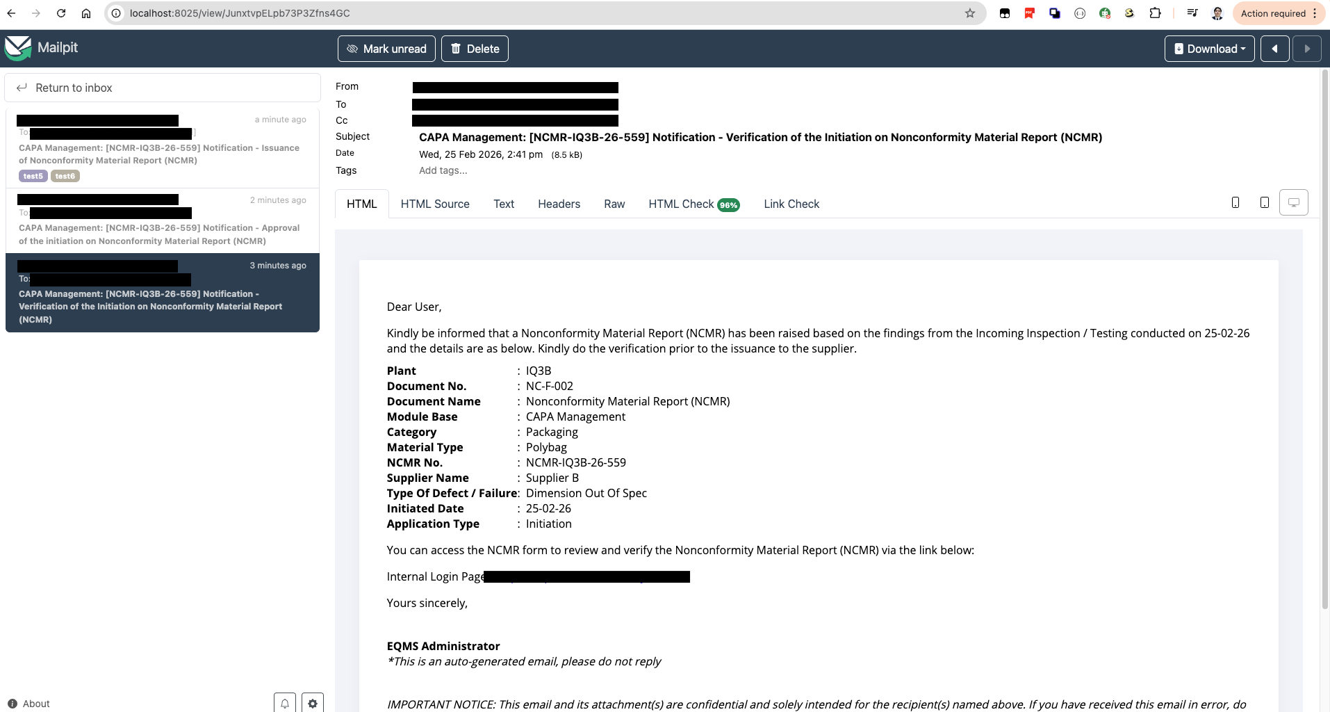 The email shown here is from one of my production projects at Kossan: NCMR.