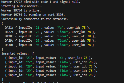This is a sample DB transaction that I console.log once clicked on "Save & Continue." The cluster is just experimenting to see its impact on NodeJS.