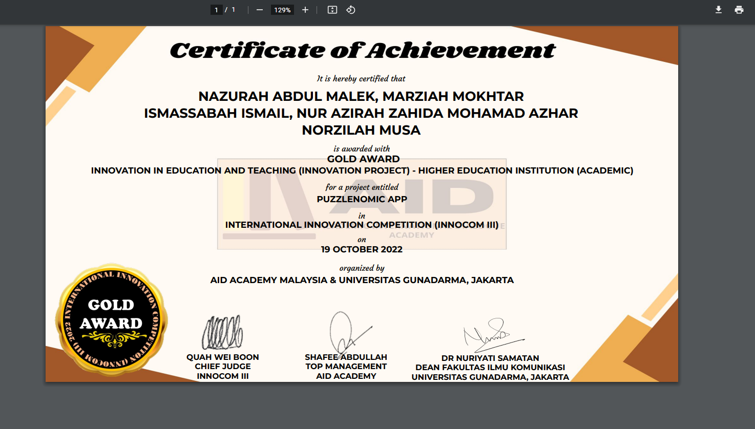 yes , puzzlEnomic has been awarded gold medal for the previous International Innovation Competition (INNOCOM III) .