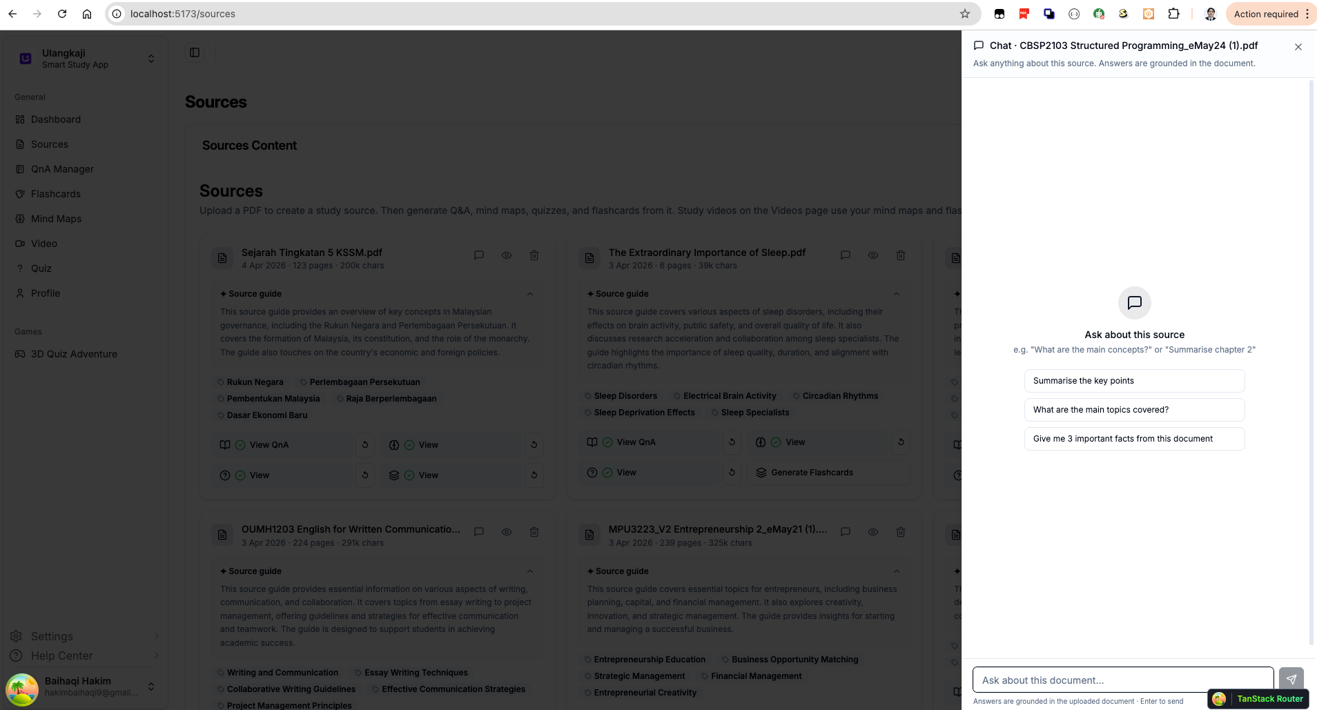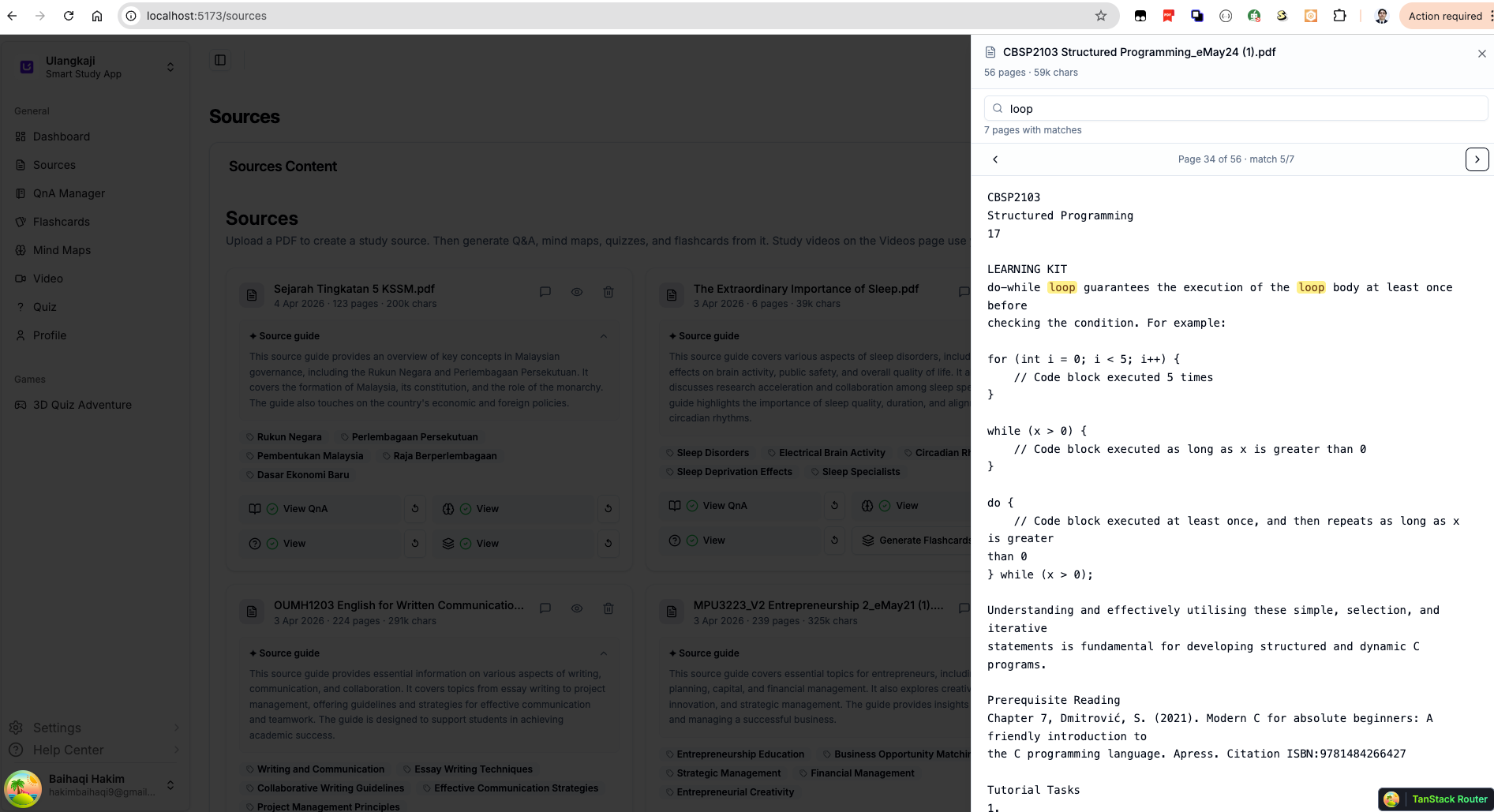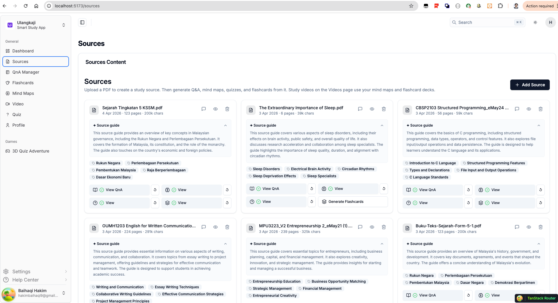 When you upload a PDF, Ulangkaji now organizes it as a proper study source. Each source comes with a cleaner overview, quick-access actions, and topic labels that make it easier to understand what the document contains before you even open it.
