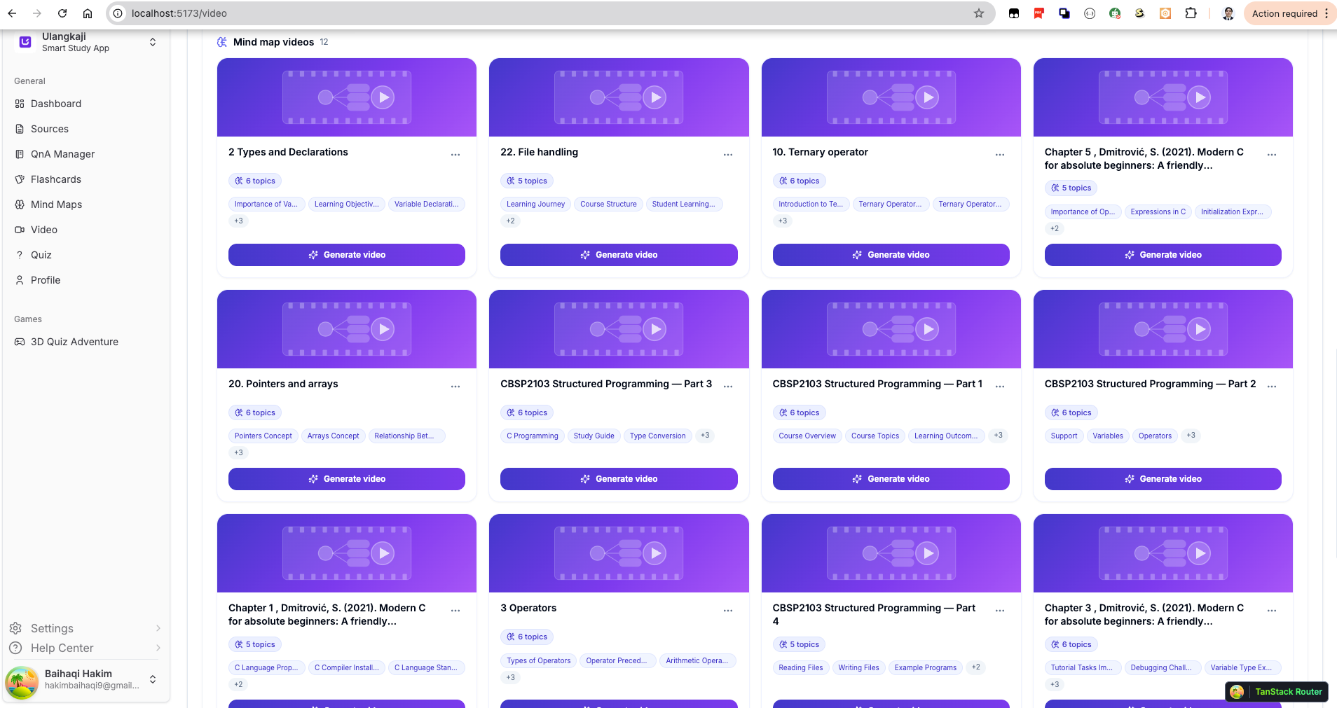 Instead of only reading a map, students can generate a visual video version of it. The platform displays available topic cards and lets users generate a video from the selected structure. This opens a new study format for learners who remember better through motion, pacing, and visual repetition.