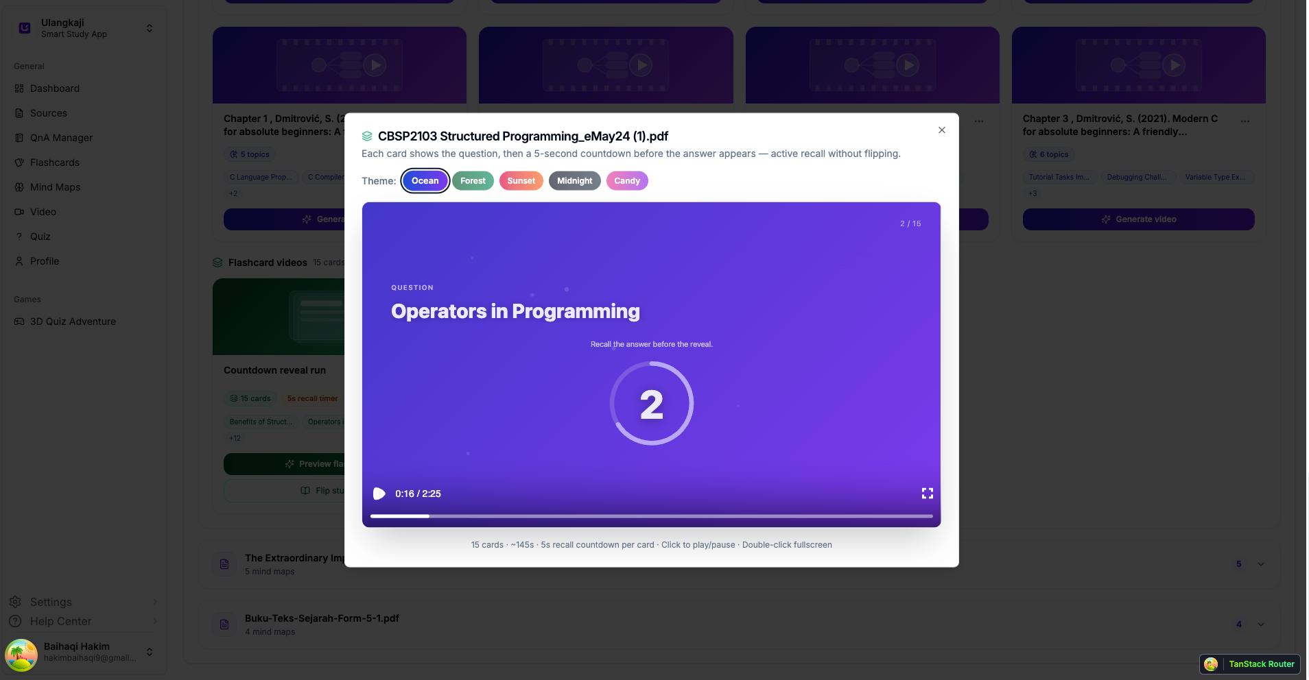 A new flashcard video mode now shows the question first, gives the student a short countdown to think, and only then reveals the answer. This is a much more active style of recall compared to simply flipping a card instantly.